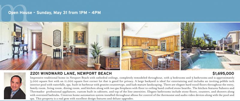 Open House – Sunday, May 31 from 1PM – 4PM 2201 WINDWARD LANE, NEWPORT BEACH $1,695,000 Impressive traditional home in Newport Beach with cathedral ceilings, completely remodeled throughout, with 4 bedrooms and 3 bathrooms and is approximately 3,000 square feet with an 11,000 square foot corner lot that is gated for privacy. A large backyard is ideal for entertaining and includes an inviting pebble tech spa. This property is a real gem with excellent design features and deluxe upgrades.