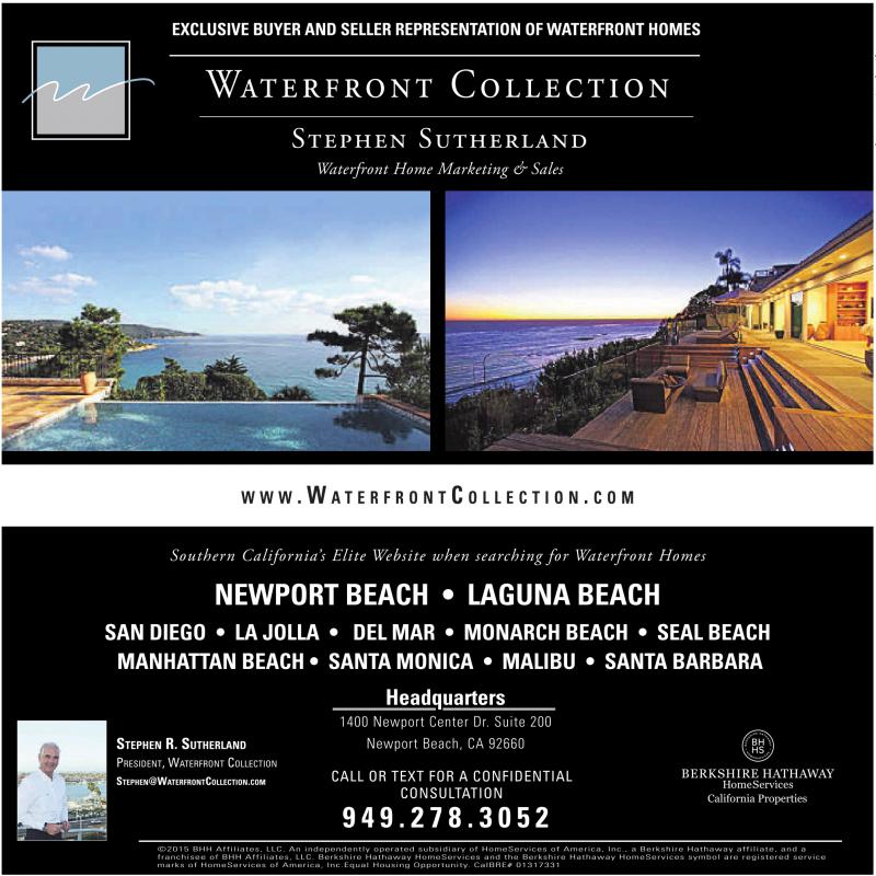 EXCLUSIVE BUYER AND SELLER REPRESENTATION OF WATERFRONT HOMES Wat e r f r o n t C o l l e c t i o n Stephen Sutherl and Waterfront Home Marketing & Sales W W W . W A T E R F R O N T C O L L E C T I O N . C O M Southern California’s Elite Website when searching for Waterfront Homes SAN DIEGO • LA JOLLA • DEL MAR • MONARCH BEACH • SEAL BEACH MANHATTAN BEACH • SANTA MONICA • MALIBU • SANTA BARBARA STEPHEN R. SUTHERLAND PRESIDENT, WATERFRONT COLLECTION STEPHEN@WATERFRONTCOLLECTION.COM NEWPORT BEACH • LAGUNA BEACH Headquarters 1400 Newport Center Dr. Suite 200 Newport Beach, CA 92660 CALL OR TEXT FOR A CONFIDENTIAL CONSULTATION 9 4 9 . 2 7 8 . 3 0 5 2 ©2015 BHH Affiliates, LLC. An independently operated subsidiary of HomeServices of America, Inc., a Berkshire Hathaway affiliate, and a franchisee of BHH Affiliates, LLC. Berkshire Hathaway HomeServices and the Berkshire Hathaway HomeServices symbol are registered service marks of HomeServices of America, Inc.Equal Housing Opportunity. CalBRE# 01317331