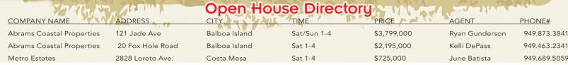 COMPANY NAME ADDRESS CITY TIME PRICE AGENT PHONE# Abrams Coastal Properties 121 Jade Ave Balboa Island Sat/Sun 1-4 $3,799,000 Ryan Gunderson 949.873.3841 Abrams Coastal Properties 20 Fox Hole Road Balboa Island Sat 1-4 $2,195,000 Kelli DePass 949.463.2341 Metro Estates 2828 Loreto Ave. Costa Mesa Sat 1-4 $725,000 June Batista 949.689.5059