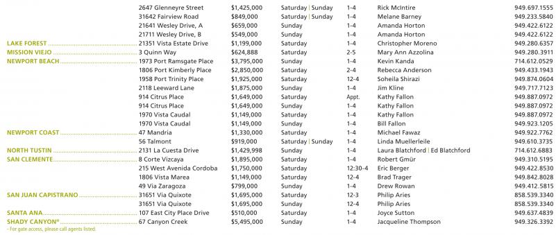 2647 Glenneyre Street $1,425,000 Saturday | Sunday 1-4 Rick McIntire 949.697.1555 31642 Fairview Road $849,000 Saturday | Sunday 1-4 Melane Barney 949.233.5840 21641 Wesley Drive, A $659,000 Sunday 1-4 Amanda Horton 949.422.6122 21711 Wesley Drive, B $549,000 Sunday 1-4 Amanda Horton 949.422.6122 LAKE FOREST .................................................... 21351 Vista Estate Drive $1,199,000 Saturday 1-4 Christopher Moreno 949.280.6357 MISSION VIEJO ................................................. 3 Quinn Way $624,888 Saturday 2-5 Mary Ann Azzolina 949.280.3911 NEWPORT BEACH ............................................. 1973 Port Ramsgate Place $3,795,000 Sunday 1-4 Kevin Kanda 714.612.0529 1806 Port Kimberly Place $2,850,000 Saturday 2-4 Rebecca Anderson 949.433.1943 1958 Port Trinity Place $1,925,000 Saturday 12-4 Soheila Shirazi 949.874.0604 2118 Leeward Lane $1,875,000 Sunday 1-4 Jim Kline 949.717.7123 914 Citrus Place $1,649,000 Saturday Appt. Kathy Fallon 949.887.0972 914 Citrus Place $1,649,000 Sunday 1-4 Kathy Fallon 949.887.0972 1970 Vista Caudal $1,149,000 Saturday 1-4 Kathy Fallon 949.887.0972 1970 Vista Caudal $1,149,000 Sunday 1-4 Bill Fallon 949.923.1205 NEWPORT COAST ............................................. 47 Mandria $1,330,000 Saturday 1-4 Michael Fawaz 949.922.7762 56 Talmont $919,000 Saturday | Sunday 1-4 Linda Muellerleile 949.610.3735 NORTH TUSTIN ................................................. 2131 La Cuesta Drive $1,429,998 Sunday 1-4 Laura Blatchford | Ed Blatchford 714.612.6883 SAN CLEMENTE................................................. 8 Corte Vizcaya $1,895,000 Saturday 1-4 Robert Gmür 949.310.5195 215 West Avenida Cordoba $1,750,000 Saturday 12:30-4 Eric Berger 949.422.8530 1806 Vista Marea $1,149,000 Saturday 12-4 Brad Trager 949.842.8028 49 Via Zaragoza $799,000 Sunday 1-4 Drew Rowan 949.412.5815 SAN JUAN CAPISTRANO.................................. 31651 Via Quixote $1,695,000 Saturday 12-3 Philip Aries 858.539.3340 31651 Via Quixote $1,695,000 Sunday 12-4 Philip Aries 858.539.3340 SANTA ANA....................................................... 107 East City Place Drive $510,000 Saturday 1-4 Joyce Sutton 949.637.4839 SHADY CANYON ® ............................................. 67 Canyon Creek $5,495,000 Sunday 1-4 Jacqueline Thompson 949.326.3392 -For gate access,pleasecallagentslisted.
