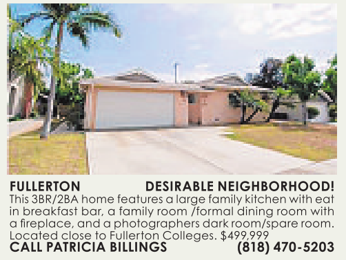 FULLERTON DESIRABLE NEIGHBORHOOD! This 3BR/2BAhomefeaturesalarge family kitchenwitheat in breakfast bar, afamily room /formal dining room with afireplace,and aphotographers dark room/spare room. Located close to Fullerton Colleges. $499,999 CALL PATRICIA BILLINGS (818) 470-5203