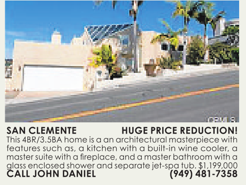 SAN CLEMENTE HUGE PRICE REDUCTION! This 4BR/3.5BAhomeisaanarchitectural masterpiece with features such as, akitchen with abuilt-in wine cooler, a mastersuite with afireplace, andamasterbathroomwith a glassenclosedshowerand separate jet-spatub.$1,199,000 CALL JOHN DANIEL (949) 481-7358