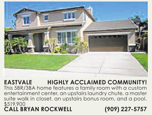 EASTVALE HIGHLY ACCLAIMED COMMUNITY! This 5BR/3BA home features afamily room with acustom entertainment center, an upstairs laundry chute, amaster suite walk in closet, anupstairs bonus room, and apool. $519,900 CALL BRYAN ROCKWELL (909) 227-5757