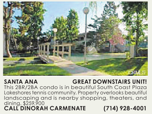 This 2BR/2BA condo is in beautiful South Coast Plaza Lakeshorestennis community.Propertyoverlooks beautiful landscaping and is nearby shopping, theaters, and dining. $259,900 CALL DINORAH CARMENATE (714) 928-4001