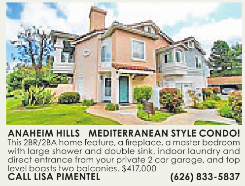 ANAHEIM HILLS MEDITERRANEAN STYLE CONDO! This 2BR/2BAhome feature, afireplace, amasterbedroom with large shower and double sink, indoor laundry and direct entrance from your private 2car garage, and top level boasts two balconies. $417,000 CALL LISA PIMENTEL (626) 833-5837
