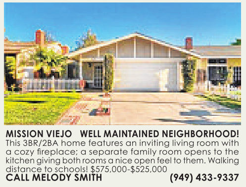 MISSION VIEJO WELL MAINTAINED NEIGHBORHOOD! This 3BR/2BA home features aninviting living room with acozy fireplace; aseparate family room opens tothe kitchengiving both roomsanice open feel to them. Walking distance toschools! $575,000-$525,000 CALL MELODY SMITH (949) 433-9337