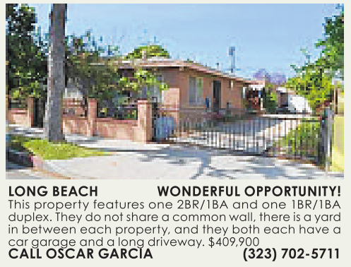 LONG BEACH WONDERFUL OPPORTUNITY! This property features one 2BR/1BA and one 1BR/1BA duplex.Theydonot shareacommonwall, thereisayard in between each property, and they both each have a car garage and along driveway. $409,900 CALL OSCAR GARCIA (323) 702-5711