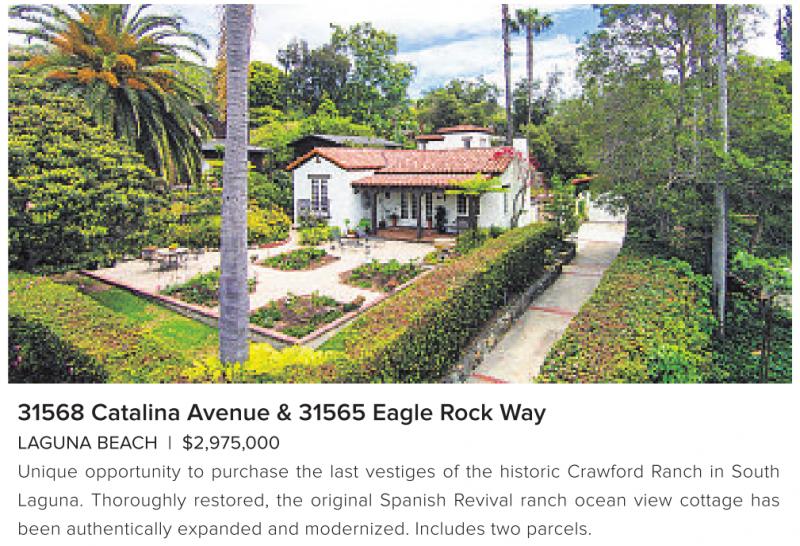 31568 Catalina Avenue & 31565 Eagle Rock Way LAGUNA BEACH | $2,975,000 Unique opportunity to purchase the last vestiges of the historic Crawford Ranch in South Laguna. Thoroughly restored, the original Spanish Revival ranch ocean view cottage has been authentically expanded and modernized. Includes two parcels.