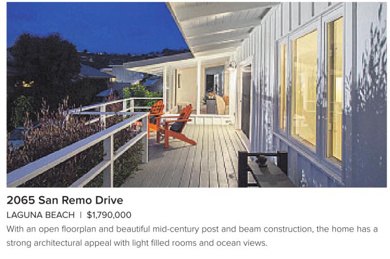 LAGUNA BEACH | $1,790,000 With an open floorplan and beautiful mid-century post and beam construction, the home has a strong architectural appeal with light filled rooms and ocean views.