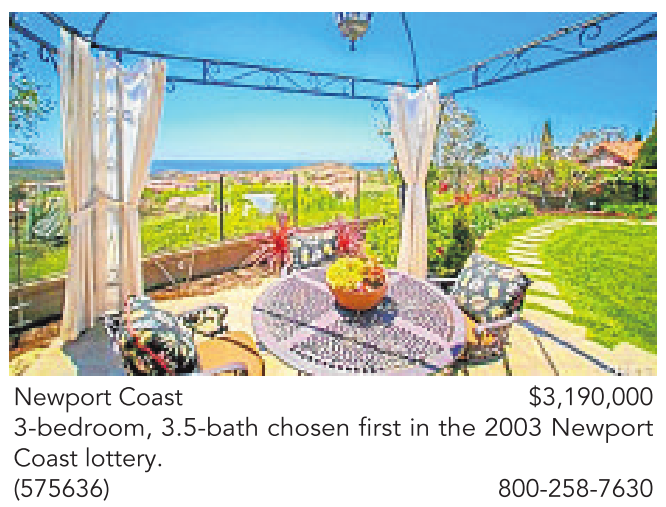 Newport Coast $3,190,000 3-bedroom, 3.5-bath chosen first in the 2003 Newport Coast lottery. (575636) 800-258-7630