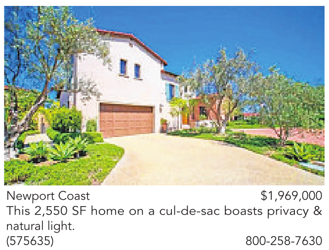 Newport Coast $1,969,000 This 2,550 SF home on a cul-de-sac boasts privacy & natural light. (575635) 800-258-7630