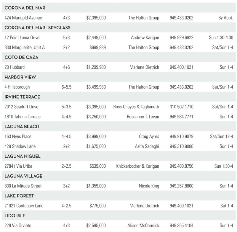 CORONA DEL MAR 424 Marigold Avenue 4+3 $2,395,000 The Halton Group 949.433.0202 By Appt. CORONA DEL MAR -SPYG SS 12 Point Loma Drive 5+3 $2,449,000 Andrew Karigan 949.929.6922 Sun 1:30-4:30 330 Marguerite, Unit A 2+2 $999,989 The Halton Group 949.433.0202 Sat/Sun 1-4 COTO DE CAZA 20 Hubbard 4+5 $1,299,900 Marlene Dietrich 949.400.1021 Sun 1-4 HARBOR VIEW 4Hillsborough 6+5.5 $3,499,989 The Halton Group 949.433.0202 Sat/Sun 1-4 IRVINE TERRACE 2012 Seadrift Drive 5+3.5 $3,395,000 Ross-Chayes &Taglianetti 310.502.1710 Sat/Sun 1-4 1810 Tahuna Terrace 4+4.5 $3,250,000 Roseanne T. Levan 949.584.7771 Sun 1-4 GUNA BEACH 163 Nyes Place 4+4.5 $3,999,000 Craig Ayres 949.910.9079 Sat/Sun 12-4 429 Shadow Lane 2+2 $1,675,000 Azita Sadeghi 949.310.9006 Sun 1-4 GUNA NIGUEL 27841 ViaUribe 2+2.5 $539,000 Knickerbocker &Karigan 949.400.8750 Sun 1:30-4 GUNA VIL GE 830 La Mirada Street 3+2 $1,359,000 Nicole King 949.257.8800 Sun 1-4 KE FOREST 21021 Cantebury Lane 4+2.5 $775,000 Marlene Dietrich 949.400.1021 Sat 1-4 LIDO ISLE 228 ViaOrvieto 4+3 $2,595,000 Alison McCormick 949.355.4104 Sun 1-4 See also