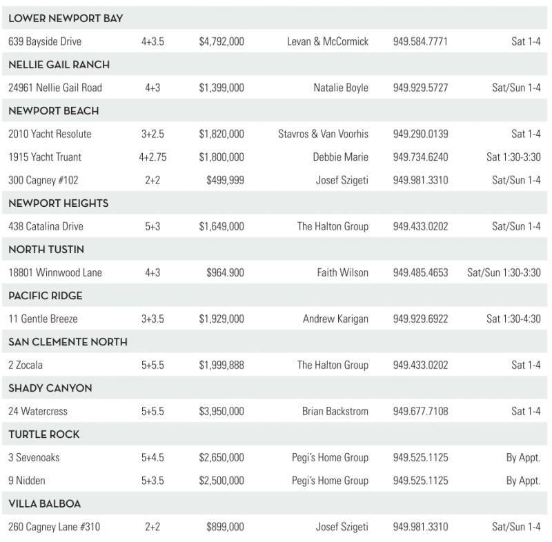 LOWER NEWPORTBAY 639 Bayside Drive 4+3.5 $4,792,000 Levan &McCormick 949.584.7771 Sat 1-4 NELLIE GAIL RANCH 24961Nellie Gail Road 4+3 $1,399,000 Natalie Boyle 949.929.5727 Sat/Sun 1-4 NEWPORTBEACH 2010 Yacht Resolute 3+2.5 $1,820,000 Stavros &Van Voorhis 949.290.0139 Sat 1-4 1915 Yacht Truant 4+2.75 $1,800,000 Debbie Marie 949.734.6240 Sat 1:30-3:30 300 Cagney #102 2+2 $499,999 Josef Szigeti 949.981.3310 Sat/Sun 1-4 NEWPORTHEIGHTS 438 Catalina Drive 5+3 $1,649,000 The Halton Group 949.433.0202 Sat/Sun 1-4 NORTH TUSTIN 18801 Winnwood Lane 4+3 $964.900 Faith Wilson 949.485.4653 Sat/Sun 1:30-3:30 PACIFIC RIDGE 11 Gentle Breeze 3+3.5 $1,929,000 Andrew Karigan 949.929.6922 Sat 1:30-4:30 SANCLEMENTE NORTH 2Zocala 5+5.5 $1,999,888 The Halton Group 949.433.0202 Sat 1-4 SHADYCANYON 24 Watercress 5+5.5 $3,950,000 Brian Backstrom 949.677.7108 Sat 1-4 TURTLE ROCK 3Sevenoaks 5+4.5 $2,650,000 Pegi’sHome Group 949.525.1125 By Appt. 9Nidden 5+3.5 $2,500,000 Pegi’sHomeGroup 949.525.1125 ByAppt. VIL BALBOA 260 Cagney Lane #310 2+2 $899,000 Josef Szigeti 949.981.3310 Sat/Sun 1-4