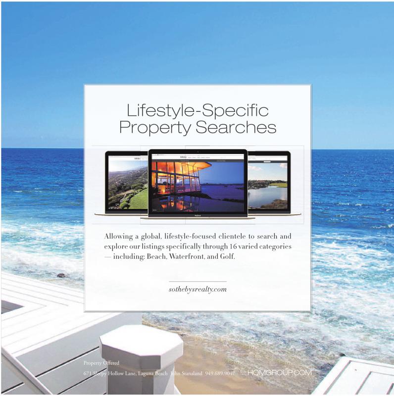 Lifestyle-Specific Property Searches Allowing a global, lifestyle-focused clientele to search and explore our listings specifically through 16 varied categories — including: Beach, Waterfront, and Golf. sothebysrealty.com Property Offered 671 Sleepy Hollow Lane, Laguna Beach John Stanaland 949.689.9047 HOMGROUP.COM