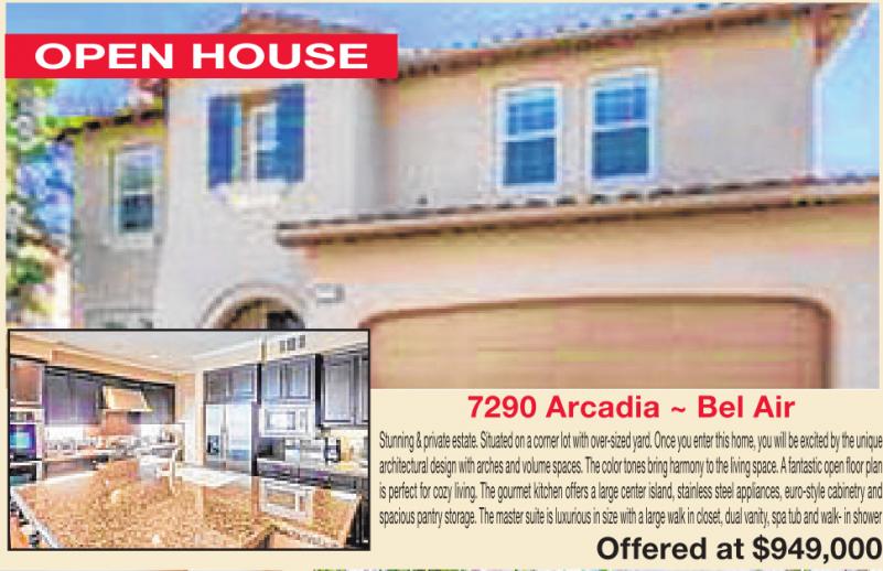 OPEN HOUSE 7290 Arcadia ~ Bel Air Stunning &private estate. Situated on acornerlot with over-sizedyard. Once youenter this home, youwill be excited by theunique architectural designwith archesand volume spaces. Thecolor tonesbring harmony to thelivingspace.Afantastic openfloor plan is perfect for cozy living. The gourmet kitchen offers alarge center island, stainless steel appliances, euro-style cabinetry and spacious pantry storage. The master suite isluxurious in size with alarge walk in closet, dual vanity, spa tub and walk- inshower Offered at $949,000