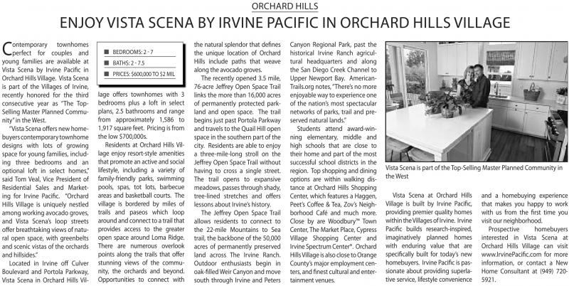 townhomes perfect for couples and young families are available at Vista Scena by Irvine Pacific in OrchardHills Village. Vista Scena is part of the Villages of Irvine, recently honored for the third consecutive year as “The Top- Selling Master Planned Community”in the West.