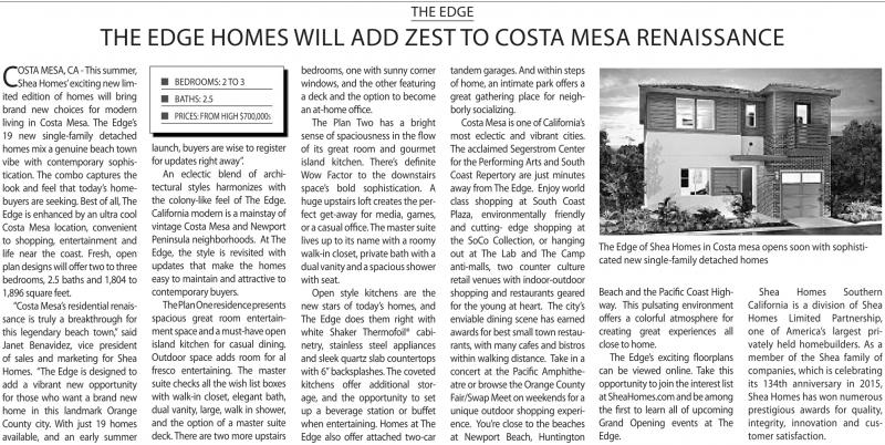 Ca -This summer, shea Homes’excitingnew limited edition of homes will bring brand new choices for modern living in Costa Mesa. The Edge’s 19 new single-family detached homes mix agenuine beach town vibe with contemporary sophistication. The combo captures the look and feel that today’s homebuyers areseeking.Bestofall,The Edge is enhanced by an ultracool Costa Mesa location, convenient to shopping, entertainment and life near the coast. fresh, open plan designs will offer twotothree bedrooms, 2.5 baths and 1,804 to 1,896 squarefeet.