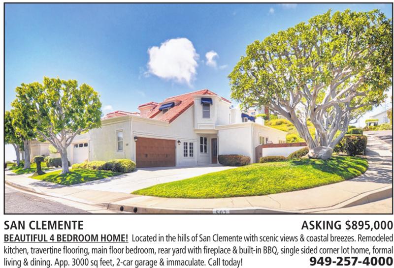 SAN CLEMENTE ASKING $895,000 BEAUTIFUL4BEDROOMHOME! Located in thehillsofSan Clemente with scenic views&coastal breezes. Remodeled kitchen,travertineflooring,main floorbedroom, rear yard with fireplace &built-inBBQ,single sided corner lothome,formal living &dining. App. 3000 sq feet,2-car garage&immaculate. Call today! 949-257-4000