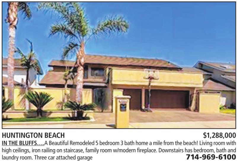 HUNTINGTON BEACH $1,288,000 IN THEBLUFFS….ABeautifulRemodeled5bedroom3bath home amilefromthe beach!Living room with high ceilings,iron railingonstaircase, family room w/modern fireplace.Downstairshas bedroom, bath and laundryroom. Threecar attachedgarage 714-969-6100