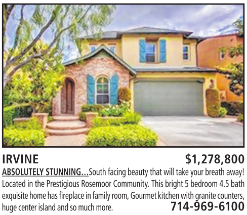 Located in thePrestigious Rosemoor Community. This bright5bedroom4.5 bath exquisite home hasfireplace in family room, Gourmetkitchen with granite counters, huge center island and so muchmore. 714-969-6100 IRVINE $1,278,800 ABSOLUTELYSTUNNING…Southfacing beauty that will take your breathaway!