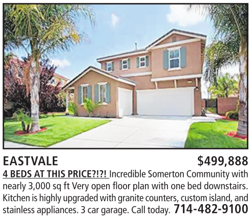 EASTVALE $499,888 4BEDSATTHIS PRICE?!?! Incredible Somerton Communitywith nearly 3,000 sq ft Very openfloorplanwithone bed downstairs. Kitchen is highly upgraded with granitecounters, customisland, and stainlessappliances. 3car garage.Calltoday. 714-482-9100