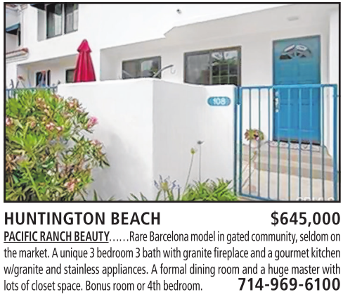 HUNTINGTON BEACH $645,000 PACIFIC RANCHBEAUTY……Rare Barcelonamodel in gatedcommunity, seldom on themarket. Aunique 3bedroom 3bathwithgranitefireplace andagourmetkitchen w/graniteand stainlessappliances. Aformal diningroomand ahugemaster with lotsofcloset space.Bonus room or 4thbedroom. 714-969-6100