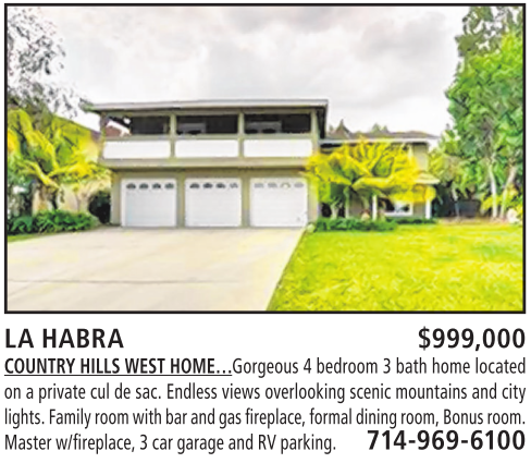 LA HABRA $999,000 COUNTRYHILLS WEST HOME…Gorgeous 4bedroom 3bath home located on aprivate cul desac. Endless views overlooking scenic mountains and city lights.Familyroom with bar andgas fireplace,formal dining room,Bonus room. Master w/fireplace, 3car garageand RV parking. 714-969-6100