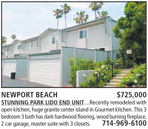 NEWPORT BEACH $725,000 STUNNING PARK LIDO END UNIT....Recently remodeledwith openkitchen, huge granitecenter island in Gourmet kitchen. This 3 bedroom3bathhas darkhardwood flooring, wood burning fireplace, 2car garage, mastersuitewith3closets. 714-969-6100
