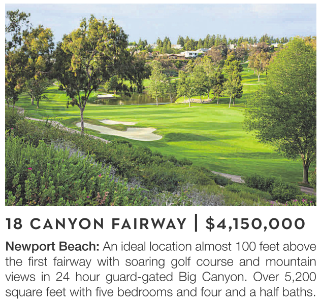 18 CANYON FAIRWAY | $4,150,000 Newport Beach: An ideal location almost 100 feet above the first fairway with soaring golf course and mountain views in 24 hour guard-gated Big Canyon. Over 5,200 square feet with five bedrooms and four and a half baths.