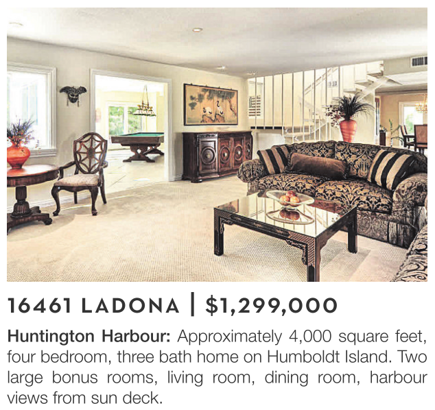Huntington Harbour: Approximately 4,000 square feet, four bedroom, three bath home on Humboldt Island. Two large bonus rooms, living room, dining room, harbour views from sun deck.