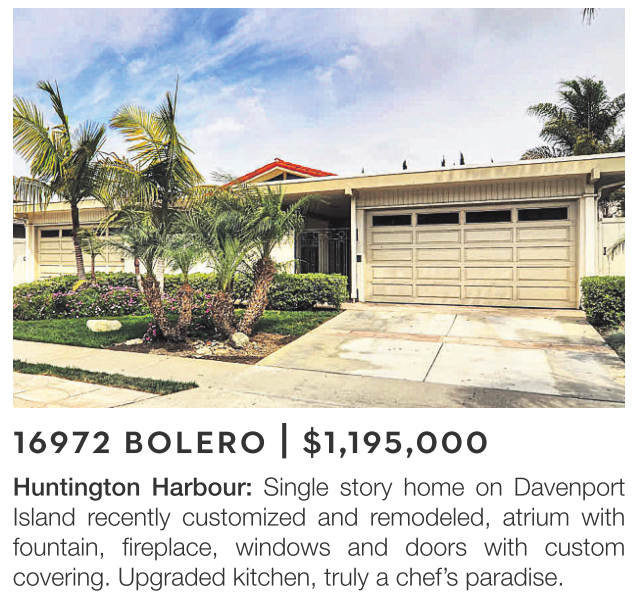 Huntington Harbour: Single story home on Davenport Island recently customized and remodeled, atrium with fountain, fireplace, windows and doors with custom covering. Upgraded kitchen, truly a chef’s paradise.