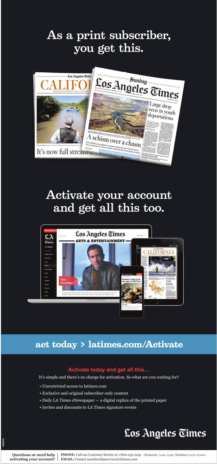 As a print subscriber, you get this. Activate your account and get all this too. act today > latimes.com/Activate Activate today and get all this… It’s simple and there’s no charge for activation. So what are you waiting for? • Unrestricted access to latimes.com • Exclusive and original subscriber-only content • Daily LA Times eNewspaper — a digital replica of the printed paper • Invites and discounts to LA Times signature events Questions or need help activating your account? PHONE: Call our Customer Service at 1-800-252-9141 (Weekends, 7 a.m.-1 p.m.; Weekdays, 6 a.m.-6 p.m.) EMAIL: Contact membershipservices@latimes.com