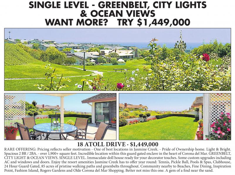 RARE OFFERING: Pricing reflects seller motivation - One of best locations in Jasmine Creek. - Pride of Ownership home. Light & Bright. Spacious 2 BR / 2BA. - over 1,900+ square feet. Incredible location within this guard gated enclave in the heart of Corona del Mar. GREENBELT, CITY LIGHT & OCEAN VIEWS. SINGLE LEVEL. Immaculate doll house ready for your decorator touches. Some custom upgrades including AC and windows and doors. Enjoy the resort amenities Jasmine Creek has to offer year round: Tennis, Pickle Ball, Pools & Spas, Clubhouse, 24 Hour Guard Gated, 85 acres of pristine walking paths and greenbelts throughout. Community nearby to Beaches, Fine Dining, Inspiration Point, Fashion Island, Rogers Gardens and Olde Corona del Mar Shopping. Better not miss this one. A gem of a find near the sand.