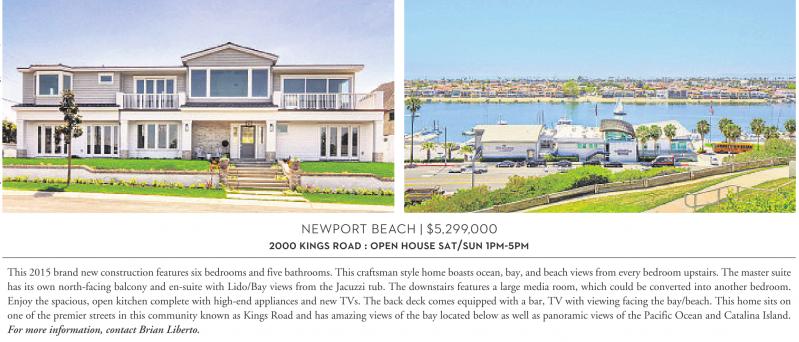 10 NEWPORT BEACH | $5,299,000 2000 KINGS ROAD : OPEN HOUSE SAT/SUN 1PM-5PM This 2015 brand new construction features six bedrooms and five bathrooms. This craftsman style home boasts ocean, bay, and beach views from every bedroom upstairs. The master suite has its own north-facing balcony and en-suite with Lido/Bay views from the Jacuzzi tub. The downstairs features a large media room, which could be converted into another bedroom. Enjoy the spacious, open kitchen complete with high-end appliances and new TVs. The back deck comes equipped with a bar, TV with viewing facing the bay/beach. This home sits on one of the premier streets in this community known as Kings Road and has amazing views of the bay located below as well as panoramic views of the Pacific Ocean and Catalina Island. For more information, contact Brian Liberto.