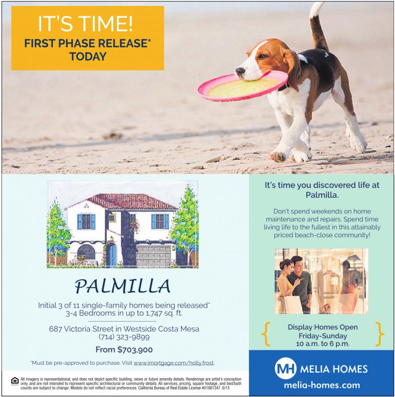 EQUAL HOUSIN G IT’S TIME! FIRST PHASE RELEASE* TODAY It’s time you discovered life at Palmilla. Don’t spend weekends on home maintenance and repairs. Spend time living life to the fullest in this attainably priced beach-close community! Initial 3 of 11 single-family homes being released* 3-4 Bedrooms in up to 1,747 sq. ft. 687 Victoria Street in Westside Costa Mesa (714) 323-9899 From $703,900 Display Homes Open Friday-Sunday 10 a.m. to 6 p.m. *Must be pre-approved to purchase. Visit www.imortgage.com/holly.frost. OPPORTUNI TY All imagery is representational, and does not depict specific building, views or future amenity details. Renderings are artist’s conception only,and are not intended to represent specific architectural or community details. All services, pricing, square footage, and bed/bath counts are subject to change. Models do not reflect racial preferences. California Bureau of Real Estate License #01881347. 6/15 melia-homes.com