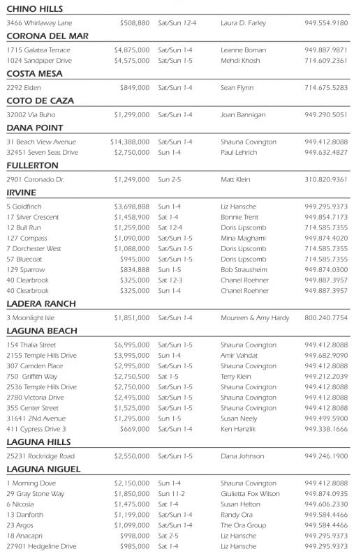 CHINO HILLS 3466 Whirlaway Lane $508,880 Sat/Sun 12-4 Laura D. Farley 949.554.9180 CORONA DEL MAR 1715 Galatea Terrace $4,875,000 Sat/Sun 1-4 Leanne Boman 949.887.9871 1024 Sandpiper Drive $4,575,000 Sat/Sun 1-5 Mehdi Khosh 714.609.2361 COSTA MESA 2292 Elden $849,000 Sat/Sun 1-4 Sean Flynn 714.675.5283 COTO DE CAZA 32002 Via Buho $1,299,000 Sat/Sun 1-4 Joan Bannigan 949.290.5051 DANA POINT 31 Beach View Avenue $14,388,000 Sat/Sun 1-4 Shauna Covington 949.412.8088 32451 Seven Seas Drive $2,750,000 Sun 1-4 Paul Lehrich 949.632.4827 FULLERTON 2901 Coronado Dr. $1,249,000 Sun 2-5 Matt Klein 310.820.9361 IRVINE 5Goldfinch $3,698,888 Sun 1-4 Liz Hansche 949.295.9373 17 Silver Crescent $1,458,900 Sat 1-4 Bonnie Trent 949.854.7173 12 Bull Run $1,259,000 Sat 12-4 Doris Lipscomb 714.585.7355 127 Compass $1,090,000 Sat/Sun 1-5 Mina Maghami 949.874.4020 7Dorchester West $1,088,000 Sat/Sun 1-5 Doris Lipscomb 714.585.7355 57 Bluecoat $945,000 Sat/Sun 1-5 Doris Lipscomb 714.585.7355 129 Sparrow $834,888 Sun 1-5 Bob Strausheim 949.874.0300 40 Clearbrook $325,000 Sat 12-3 Chanel Roehner 949.887.3957 40 Clearbrook $325,000 Sun 1-4 Chanel Roehner 949.887.3957 LADERA RANCH 3Moonlight Isle $1,851,000 Sat/Sun 1-4 Moureen &Amy Hardy 800.240.7754 LAGUNA BEACH 154 Thalia Street $6,995,000 Sat/Sun 1-5 Shauna Covington 949.412.8088 2155 Temple Hills Drive $3,995,000 Sun 1-4 Amir Vahdat 949.682.9090 307 Camden Place $2,995,000 Sat/Sun 1-5 Shauna Covington 949.412.8088 750 Griffith Way $2,750,500 Sat 1-5 Terry Klein 949.212.2039 2536 Temple Hills Drive $2,750,000 Sat/Sun 1-5 Shauna Covington 949.412.8088 2780 Victoria Drive $2,495,000 Sat/Sun 1-5 Shauna Covington 949.412.8088 355 Center Street $1,525,000 Sat/Sun 1-5 Shauna Covington 949.412.8088 31641 2Nd Avenue $1,295,000 Sun 1-5 Susan Neely 949.499.5900 411 Cypress Drive 3 $669,000 Sat/Sun 1-4 Ken Hanzlik 949.338.1666 LAGUNA HILLS 25231 Rockridge Road $2,550,000 Sat/Sun 1-5 Dana Johnson 949.246.1900 LAGUNA NIGUEL 1Morning Dove $2,150,000 Sun 1-4 Shauna Covington 949.412.8088 29 Gray Stone Way $1,850,000 Sun 11-2 Giulietta Fox Wilson 949.874.0935 6Nicosia $1,475,000 Sat 1-4 Susan Helton 949.606.2330 13 Danforth $1,199,000 Sat/Sun 1-4 Randy Ora 949.584.4466 23 Argos $1,099,000 Sat/Sun 1-4 The Ora Group 949.584.4466 18 Anacapri $998,000 Sat 2-5 Liz Hansche 949.295.9373 27901 Hedgeline Drive $985,000 Sat 1-4 Liz Hansche 949.295.9373
