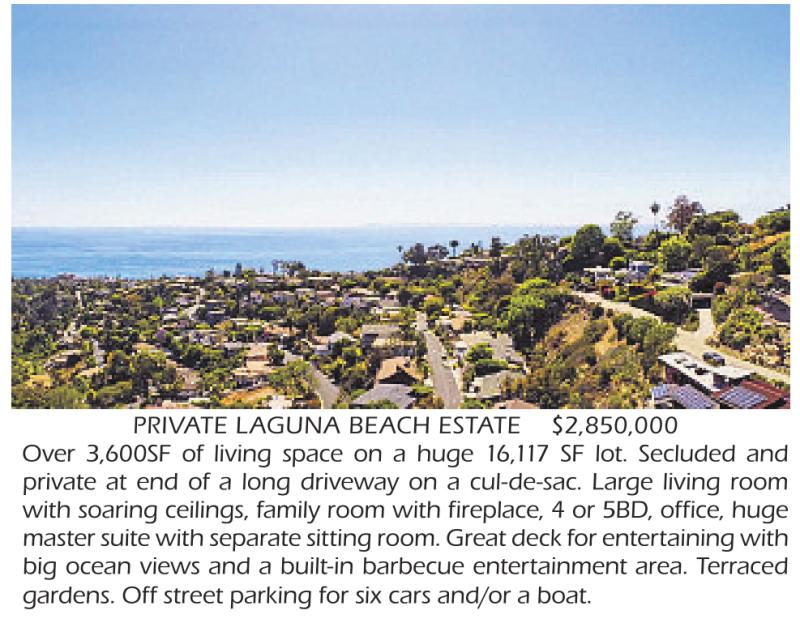 PRIVATE LAGUNA BEACH ESTATE $2,850,000 Over 3,600SF of living space on a huge 16,117 SF lot. Secluded and private at end of a long driveway on a cul-de-sac. Large living room with soaring ceilings, family room with fireplace, 4 or 5BD, office, huge master suite with separate sitting room. Great deck for entertaining with big ocean views and a built-in barbecue entertainment area. Terraced gardens. Off street parking for six cars and/or a boat.