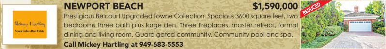 SevenGables Real Estate NEWPORT BEACH $1,590,000 Prestigious Belcourt Upgraded Towne Collection. Spacious 3600 square feet, two bedrooms three bath plus large den. Three fireplaces, master retreat, formal dining and living room. Guard gated community. Community pool and spa. C Call Mickey Hartling at 949-683-5553