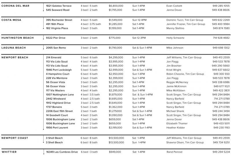 NEWPORT BEACH 214 Emerald 5 bed | 6 bath $4,299,000 Sun 1-4PM Jeff Williams, Tim Carr Group 949 413 2559 113 Via Lido Soud 4 bed | 4 bath $3,995,000 Sun 1-4PM Jon Flagg 949 533 7878 113 Via Lido Soud 4 bed | 4 bath $3,995,000 Sun 1-4PM Jim Brashier 949 290 5660 1946 Port Locksleigh 5 bed | 5 bath $2,999,000 Sat & Sun 1-4PM Kristi Wright 949 637 6602 4 Hampshire Court 6 bed | 6 bath $2,950,000 Sun 1-4PM Robin Chesnie, Tim Carr Group 949 300 550 228 Via Mentone 2 bed | 3 bath $2,399,000 Sun 1-4PM Jon Flagg 949 533 7878 56 Ocean Vista 3 bed | 3 bath $2,295,000 Sat 1-4PM Reggie McNerney 949 338 6986 56 Ocean Vista 3 bed | 3 bath $2,295,000 Sun 1-4PM Jamie McKinnon 949 677 1021 117 Via Waziers 4 bed | 4 bath $2,295,000 Sun 1-4PM Mike McKibben 949 422 3831 1007 Nottingham Lane 4 bed | 3.5 bath $1,879,000 Sat & Sun 1-4PM Scott Singer, Tim Carr Group 949 294 8484 2442 Windward 4 bed | 2.5 bath $1,695,000 Sun 1-4PM Nancy Barfield 714 271 0789 1912 Highland Drive 3 bed | 2.5 bath $1,649,000 Sun 1-4PM Scott Singer, Tim Carr Group 949 294 8484 1737 Bonaire 5 bed | 3 bath $1,362,000 Sun 1-4PM Nancy Barfield 714 271 0789 2206 East 15th Street 2 bed | 1 bath $1,275000 Sat & Sun 1-4PM Michael Shank 949 244 3494 14 Goodwill Court 4 bed | 3 bath $1,090,000 Sat & Sun 1-4PM Scott Singer, Tim Carr Group 949 294 8484 1006 Buckingham Lane 2 bed | 2 bath $659,000 Sat 1-4PM Jenna Dover 949 438 8606 1006 Buckingham Lane 2 bed | 2 bath $659,000 Sun 1-4PM Elizabeth Thamer 949 433 5011 1956 Port Laurent 3 bed | 3 bath $2,199,000 Sat & Sun 1-4PM Heather Kidder 949 230 1193