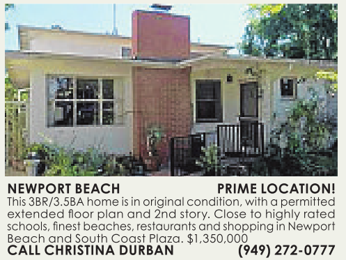 NEWPORT BEACH PRIME LOCATION! This3BR/3.5BA home is in original condition, with apermitted extended floor plan and 2nd story. Close to highly rated schools,finest beaches, restaurantsand shoppinginNewport Beach and South Coast Plaza. $1,350,000 CALL CHRISTINA DURBAN (949) 272-0777 See also