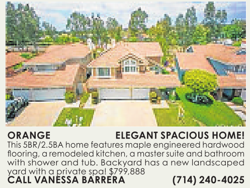ORANGE ELEGANT SPACIOUS HOME! This 5BR/2.5BA homefeaturesmaple engineeredhardwood flooring, aremodeledkitchen,amastersuite and bathroom with shower and tub. Backyard has anew landscaped yard with aprivate spa! $799,888 CALL VANESSA BARRERA (714) 240-4025