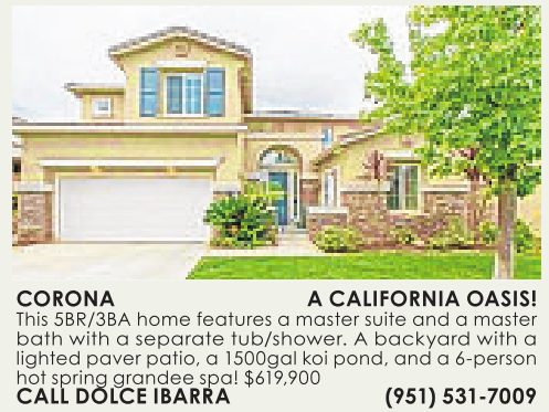 bath with a separate tub/shower. A backyard with alighted paver patio, a1500gal koi pond, and a6-person hot spring grandee spa! $619,900 CALL DOLCE IBARRA (951) 531-7009