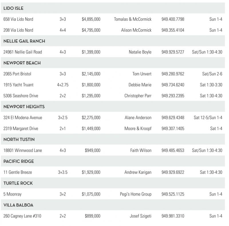 658 ViaLido Nord 3+3 $4,895,000 Tomalas &McCormick 949.400.7798 Sun 1-4 208 ViaLido Nord 4+4 $4,795,000 Alison McCormick 949.355.4104 Sun 1-4 NELLIE GAIL RANCH 24961Nellie Gail Road 4+3 $1,399,000 Natalie Boyle 949.929.5727 Sat/Sun 1:30-4:30 NEWPORTBEACH 2065 Port Bristol 3+3 $2,145,000 TomUnvert 949.280.9762 Sat/Sun 2-6 1915 Yacht Truant 4+2.75 $1,800,000 Debbie Marie 949.734.6240 Sat 1:30-3:30 5306 Seashore Drive 2+2 $1,295,000 Christopher Parr 949.293.2395 Sat 1:30-4:30 NEWPORTHEIGHTS 324 El Modena Avenue 3+2.5 $2,275,000 Alane Anderson 949.629.4348 Sat 12-5/Sun 1-4 2319 Margaret Drive 2+1 $1,449,000 Moore &Kroopf 949.307.1405 Sat 1-4 NORTH TUSTIN 18801 Winnwood Lane 4+3 $949,000 Faith Wilson 949.485.4653 Sat/Sun 1:30-4:30 PACIFIC RIDGE 11 Gentle Breeze 3+3.5 $1,929,000 Andrew Karigan 949.929.6922 Sat 1:30-4:30 TURTLE ROCK 5Moonray 3+2 $1,075,000 Pegi’sHome Group 949.525.1125 Sun 1-4 VIL BALBOA 260 Cagney Lane #310 2+2 $899,000 Josef Szigeti 949.981.3310 Sun 1-4