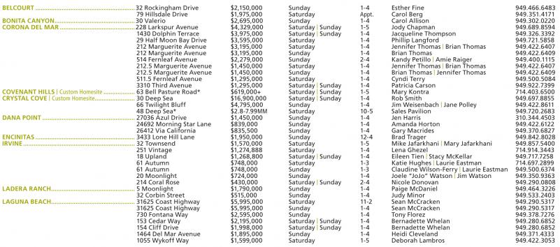 BELCOURT .........................................................32 Rockingham Drive $2,150,000 Sunday 1-4 Esther Fine 949.466.6483 79 Hillsdale Drive $1,975,000 Saturday Appt. Carol Berg 949.351.4171 BONITA CANYON..............................................30 Valerio $2,695,000 Sunday 1-4 Carol Allison 949.302.0220 CORONA DEL MAR...........................................228 Larkspur Avenue $4,329,000 Saturday | Sunday 1-5 Jody Chapman 949.689.8594 1430 Dolphin Terrace $3,975,000 Saturday | Sunday 1-4 Jacqueline Thompson 949.326.3392 29 Half Moon Bay Drive $3,595,000 Saturday 1-4 Phillip Langford 949.721.5858 212 Marguerite Avenue $3,195,000 Saturday 1-4 Jennifer Thomas | Brian Thomas 949.422.6407 212 Marguerite Avenue $3,195,000 Sunday 1-4 Brian Thomas 949.422.6409 514 Fernleaf Avenue $2,279,000 Sunday 2-4 Kandy Petillo | Amie Raiger 949.400.1115 212.5 Marguerite Avenue $1,450,000 Saturday 1-4 Jennifer Thomas | Brian Thomas 949.422.6407 212.5 Marguerite Avenue $1,450,000 Sunday 1-4 Brian Thomas | Jennifer Thomas 949.422.6409 511.5 Fernleaf Avenue $1,295,000 Saturday 1-4 Cyndi Terry 949.500.5084 3310 Third Avenue $1,295,000 Saturday | Sunday 1-4 Patricia Carson 949.922.7399 COVENANT HILLS | CustomHomesite .................. 63 Bell Pasture Road* $619,000+ Saturday | Sunday 1-5 Mary Kontra 714.403.6500 CRYSTAL COVE | CustomHomesite....................... 30 Deep Sea $16,900,000 Saturday | Sunday 1-4 Rob Smith 949.697.8855 66 Twilight Bluff $4,795,000 Sunday 1-4 Jim Weisenbach | Jane Polley 949.422.8611 48 Deep Sea* $2.8-7.99MM Saturday 10-5 Sales Pavilion 949.720.2683 DANA POINT..................................................... 27036 Azul Drive $1,450,000 Sunday 1-4 Jen Harris 310.344.4503 24692 Morning Star Lane $839,000 Sunday 1-4 Amanda Horton 949.422.6122 26412 Via California $835,500 Sunday 1-4 Gary Macrides 949.370.6827 ENCINITAS ......................................................... 3433 Lone Hill Lane $1,950,000 Sunday 12-4 Brad Trager 949.842.8028 IRVINE................................................................ 32 Townsend $1,570,000 Saturday 1-5 Mike Jafarkhani | Mary Jafarkhani 949.857.5400 251 Vintage $1,274,888 Saturday 1-4 Lena Ghezel 714.914.3443 18 Upland $1,268,800 Saturday | Sunday 1-4 Eileen Tien | Stacy McKellar 949.717.7258 61 Autumn $748,000 Saturday 1-3 Katie Hughes | Laurie Eastman 714.697.2899 61 Autumn $748,000 Sunday 1-3 Claudine Wilson-Ferry | Laurie Eastman 949.500.6374 20 Moonlight $724,000 Sunday 1-4 Joele “JoJo” Watson | Jim Watson 949.350.9363 214 Coral Rose $430,000 Saturday | Sunday 2-4 Nicole Donovan 949.290.0808 LADERA RANCH................................................ 5 Moonlight $1,790,000 Sunday 1-4 Paige McDaniel 949.464.3226 32 Corbin Street $515,000 Sunday 1-4 Judy Minor 949.533.2403 LAGUNA BEACH................................................ 31625 Coast Highway $5,995,000 Saturday 11-2 Sean McCracken 949.290.5317 31625 Coast Highway $5,995,000 Sunday 1-4 Sean McCracken 949.290.5317 730 Fontana Way $2,595,000 Sunday 1-4 Tony Florez 949.378.7276 153 Cedar Way $2,195,000 Saturday | Sunday 1-4 Bernadette Whelan 949.280.6852 154 Cliff Drive $1,998,000 Saturday | Sunday 1-4 Bernadette Whelan 949.280.6852 1464 Del Mar Avenue $1,895,000 Sunday 1-4 Heidi Cleveland 949.371.4333 1055 Wykoff Way $1,599,000 Saturday 1-5 Deborah Lambros 949.422.3053