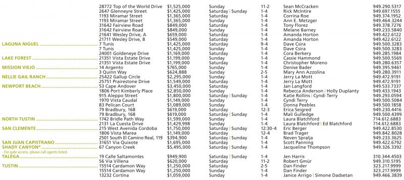 28772 Top of the World Drive $1,525,000 Sunday 11-2 Sean McCracken 949.290.5317 2647 Glenneyre Street $1,425,000 Saturday | Sunday 1-4 Rick McIntire 949.697.1555 1193 Miramar Street $1,365,000 Saturday 1-4 Corrina Roe 949.374.1952 1193 Miramar Street $1,365,000 Sunday 1-4 Ann E. Metzger 949.464.3244 31642 Fairview Road $849,000 Saturday 1-4 Tony Florez 949.378.7276 31642 Fairview Road $849,000 Sunday 1-4 Melane Barney 949.233.5840 21641 Wesley Drive, A $659,000 Saturday 1-4 Amanda Horton 949.422.6122 21711 Wesley Drive, B $549,000 Saturday 1-4 Amanda Horton 949.422.6122 LAGUNA NIGUEL.............................................. 7 Tunis $1,425,000 Saturday 9-4 Dave Csira 949.500.3283 7 Tunis $1,425,000 Sunday 1-4 Dave Csira 949.500.3283 24001 Goldeneye Drive $1,169,000 Saturday 1-4 Cora Berkery 949.285.1984 LAKE FOREST .................................................... 21351 Vista Estate Drive $1,199,000 Sunday 1-4 Cassie Hammond 949.500.5569 21351 Vista Estate Drive $1,199,000 Saturday 1-4 Christopher Moreno 949.280.6357 MISSION VIEJO ................................................. 14 Argento $765,000 Sunday 1-4 Denise Bader 949.395.9461 3 Quinn Way $624,888 Sunday 2-5 Mary Ann Azzolina 949.280.3911 NELLIE GAIL RANCH......................................... 25422 Gallup Circle $2,295,000 Sunday 1-4 Jerry La Mott 949.472.9191 25751 Prairestone Drive $1,549,000 Saturday 1-4 Jerry La Mott 949.472.9191 NEWPORT BEACH............................................. 53 Cape Andover $3,450,000 Saturday 1-4 Jan Langford 949.533.7337 1806 Port Kimberly Place $2,850,000 Sunday 1-4 Rebecca Anderson | Holly Duplanty 949.433.1943 915 Aleppo Street $1,800,000 Saturday | Sunday 1-4 Katie Rollins | Cyndi Terry 949.293.0594 1970 Vista Caudal $1,149,000 Sunday 1-4 Cyndi Terry 949.500.5084 83 Pelican Court $1,089,000 Sunday 1-4 Donna Peebles 949.500.1858 79 Bradbury, 168 $619,000 Saturday 12-3 Erica Seigred 949.230.4416 79 Bradbury, 168 $619,000 Saturday | Sunday 1-4 Mali Gulledge 949.500.4399 NORTH TUSTIN ................................................. 1742 Bridle Path Way $1,599,000 Sunday 1-4 Laura Blatchford 714.612.6883 2131 La Cuesta Drive $1,429,998 Sunday 1-4 Laura Blatchford | Ed Blatchford 714.612.6883 SAN CLEMENTE................................................. 215 West Avenida Cordoba $1,750,000 Saturday | Sunday 12:30-4 Eric Berger 949.422.8530 1806 Vista Marea $1,149,000 Saturday 12-4 Brad Trager 949.842.8028 2501 SouthElCaminoReal, 119 $394,900 Saturday | Sunday 1-4 Neven Spralja 949.233.3625 SAN JUAN CAPISTRANO.................................. 31651 Via Quixote $1,695,000 Saturday 1-4 Scott Panning 949.422.6792 SHADY CANYON ® ............................................. 67 Canyon Creek $5,495,000 Saturday | Sunday 1-4 Jacqueline Thompson 949.326.3392 -For gate access,pleasecallagentslisted. TALEGA.............................................................. 19 Calle Saltamontes $949,900 Saturday | Sunday 1-4 Jen Harris 310.344.4503 56 Via Villena $620,000 Saturday 11-2 Robert Gmür 949.310.5195 TUSTIN............................................................... 15514 Cardamon Way $1,250,000 Saturday 2-5 Dan Finder 323.217.9999 15514 Cardamon Way $1,250,000 Sunday 1-4 Dan Finder 323.217.9999 13232 Cortina $1,059,000 Sunday 1-4 Janice Arrigo | Simone Dadsetan 949.466.3839