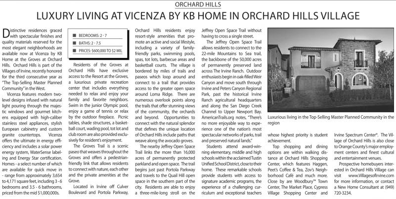 residences graced with spectacular finishes and quality materials reserved for the most elegant neighborhoods are available now at Vicenza by KB Home at the Groves at Orchard Hills. Orchard Hills is part of the VillagesofIrvine,recentlyhonored for the third consecutive year as “The Top-Selling Master Planned Community”in the West.