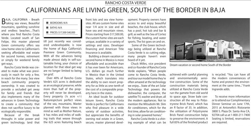 CALIFORNIA - Breath taking sea views, Beautiful mountains, sparkling sunshine and endless beaches…That’s where you find Rancho Costa Verde. Located south of San Felipe, this master planned Green community offers sea view home-sites to Californian’s seeking affordable real estate for second homes, retirement or simply for weekend family get-ways.