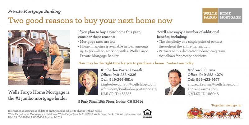 If you plan to buy a new home this year, consider these reasons: • Mortgage rates are low • Home financing is available in loan amounts up to $6 million, working with a Wells Fargo Private Mortgage Banker