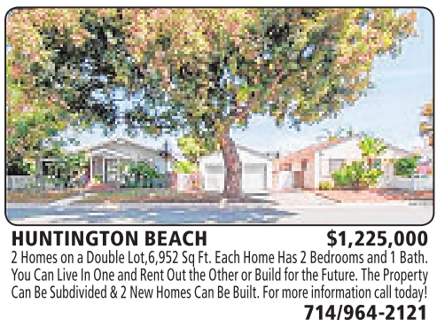 HUNTINGTON BEACH $1,225,000 2Homes on aDouble Lot,6,952SqFt. Each Home Has2Bedrooms and1Bath. YouCan Live In Oneand Rent Outthe Other or Buildfor theFuture. TheProperty CanBeSubdivided&2New Homes CanBeBuilt.For moreinformation call today! 714/964-2121