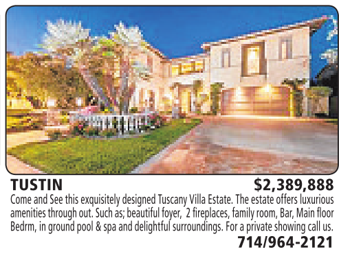 TUSTIN $2,389,888 Come andSee this exquisitelydesignedTuscany Villa Estate.The estate offersluxurious amenities throughout.Such as;beautifulfoyer, 2fireplaces, family room,Bar,Main floor Bedrm, in groundpool&spa anddelightful surroundings.For aprivateshowing call us. 714/964-2121 See also